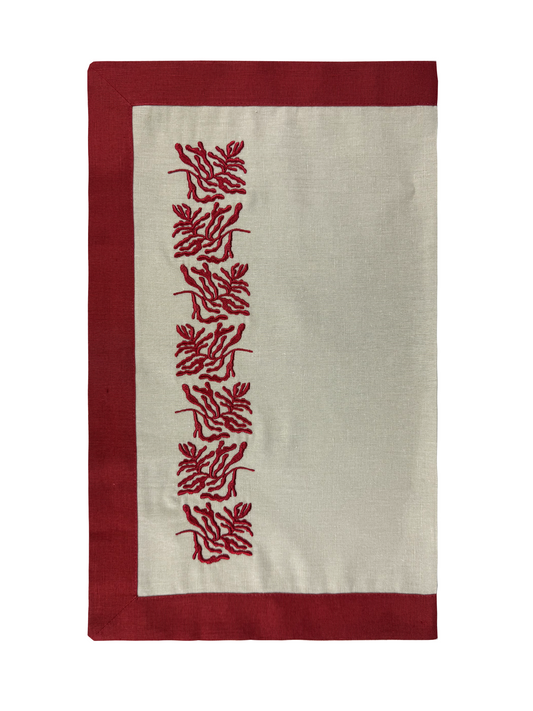 Trilho De mesa Bruma Coralina Linho Bege/Bordô Bordado 0,50x1,50