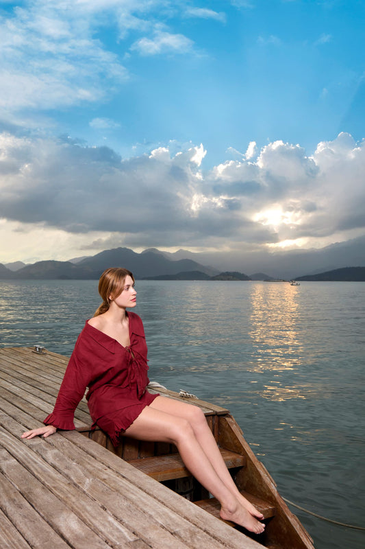 Camisa Bruma Coralina Linho Bordô Babados Bordada Tamanho Ùnico