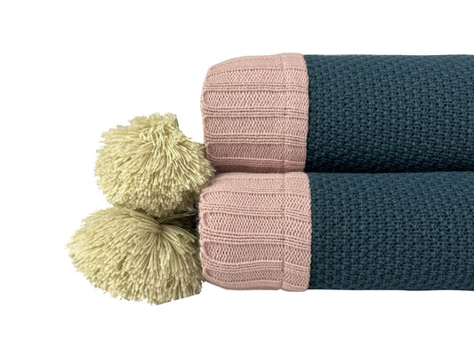 Manta Tricô Ponto Arroz Marinho Com Pompom 2,20x2,50