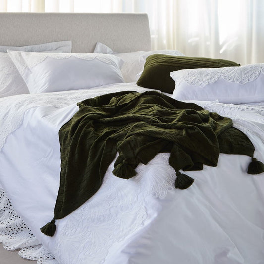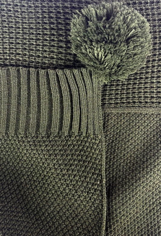 Manta Tricô Ponto Brick Verde Musgo Pompons 1,80X2,60