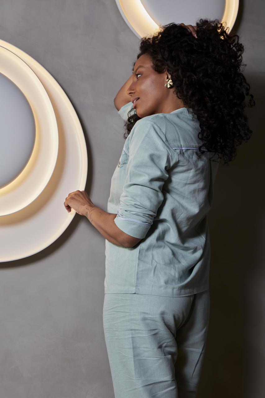Pijama feminino em linho verde pistache, com bordado e acabamentos em viés no tom lavanda, na gola, punho e barra da calça. Calça com regulagem na cintura, por cordão em viés no tom lavanda. Comprimento da manga e calça com dobra que facilita ajuste de comprimento.
