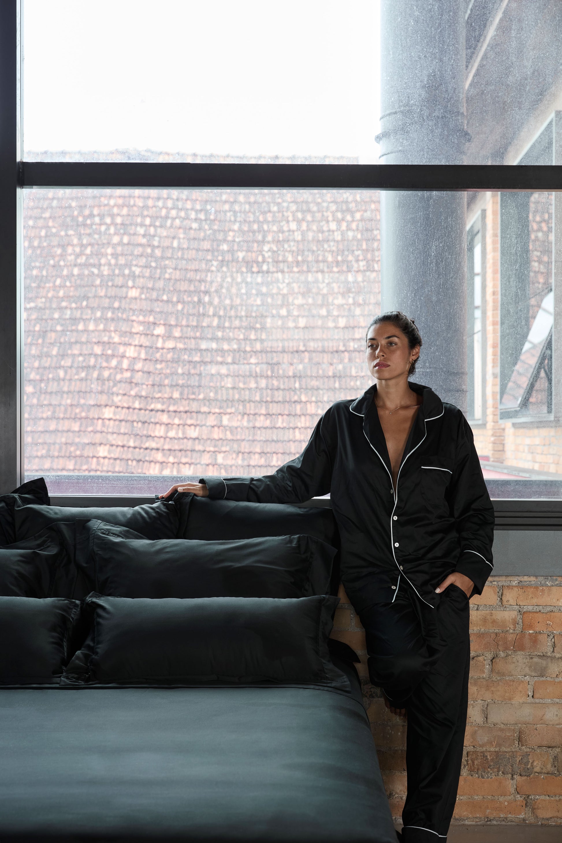 Pijama masculino/unisex em preto 600 fios, detalhes em viés em fita gorgorão, com toque macio e delicado.